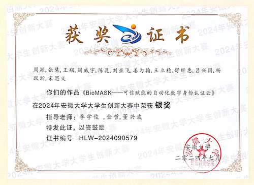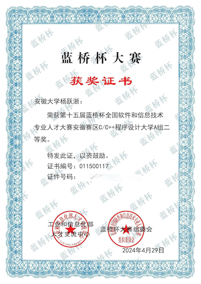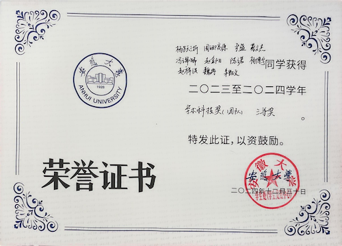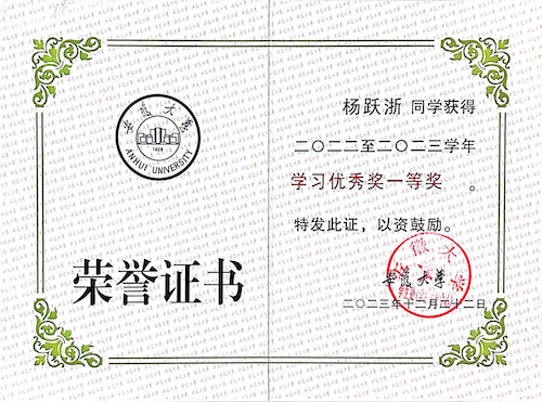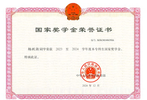 Top 0.4% nationwide, Highest Undergraduate Honors, CNY 10,000